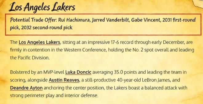 美媒《Fadeaway World》则直接撰文建议,湖人应该考虑打包将范德比尔特、八村垒、文森特、2031年的首轮签以及2032年的次轮签,以换回这位两届全明星前锋。