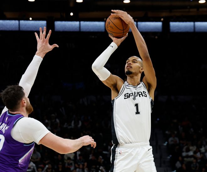马刺主场迎战爵士,马刺少了瓦塞尔,爵士少了马尔卡宁、凯斯勒,马刺全场压制爵士,最终以13分优势拿下比赛。文班18中10(三分12中7)得到33分10板2断2帽,卡斯尔9中5得到18分2板8助,哈珀7中6得到15分3板5助,爵士方面乔治20中7(三分10中4)得到30分3板6助,努尔基奇17中9得到20分9板5助。