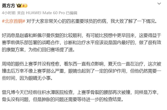 随后北京队记者勇方方更新报道,进一步说明了这4位球员的伤病情况,好消息是赵睿和斯佩尔曼恢复的比较顺利,有可能比预想中更早回来;周琦的眼伤上赛季并没有痊愈,看东西一直有点影响,夏天也一直在治疗,这次被撞击后万幸不像上赛季那么严重,眼镜也起到了一定的保护作用,但他仍然需要一些时间,因为眼睛无小事。