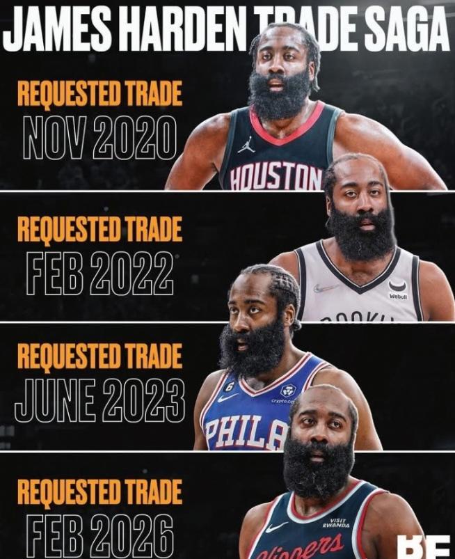 这也是哈登五年来第四次面临交易了。