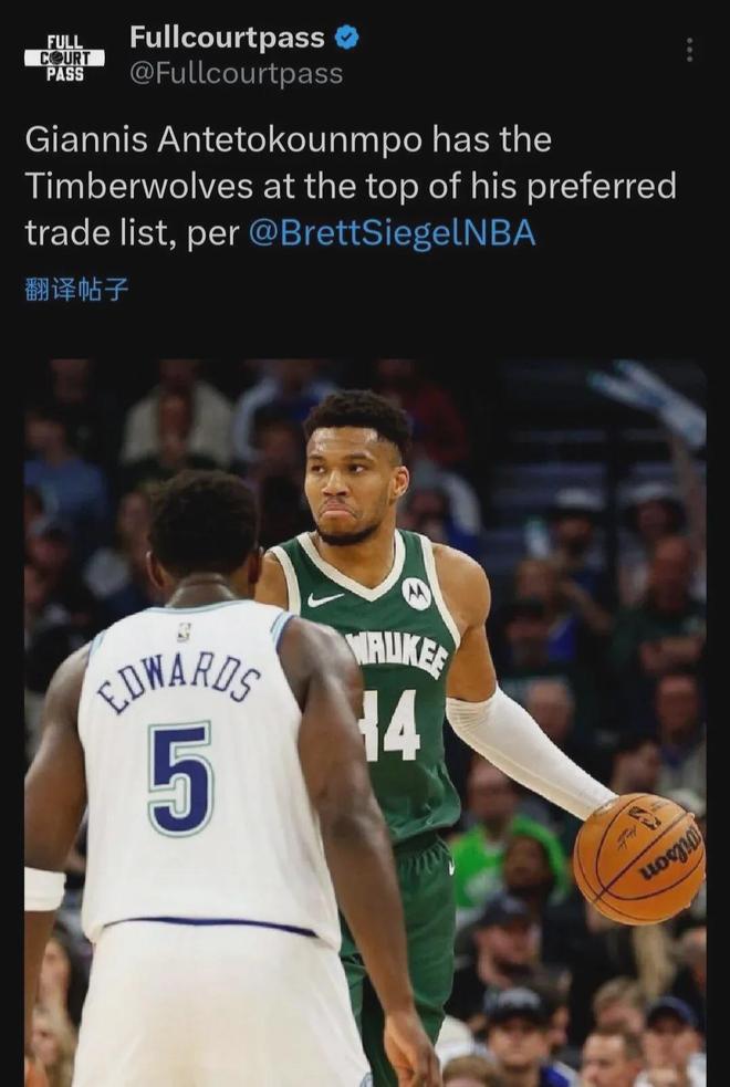 名记Siegel对此表示,字母哥把加盟森林狼&搭档爱德华兹视为首选,有望今年交易截止日(2月6日)前就空降到明尼苏达。