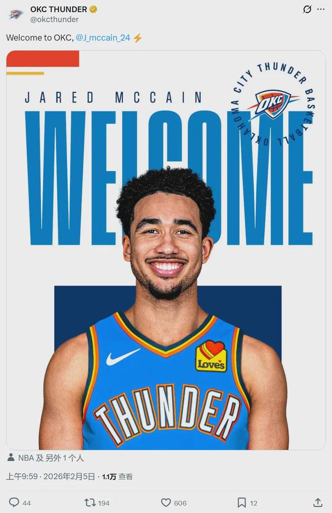 北京时间2月5日,卫冕冠军雷霆队官宣达成两笔交易:1、用1个首轮签和3个次轮签,4换1从76人交易得到贾里德-麦凯恩;2、用奥斯曼-吉昂和1个次轮签,2换1从黄蜂得到梅森-普拉姆利。雷霆还没有决定,是否裁掉普拉姆利。