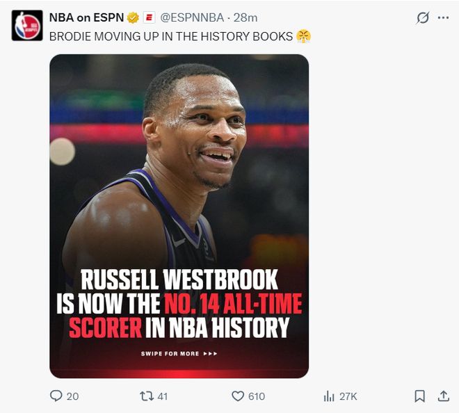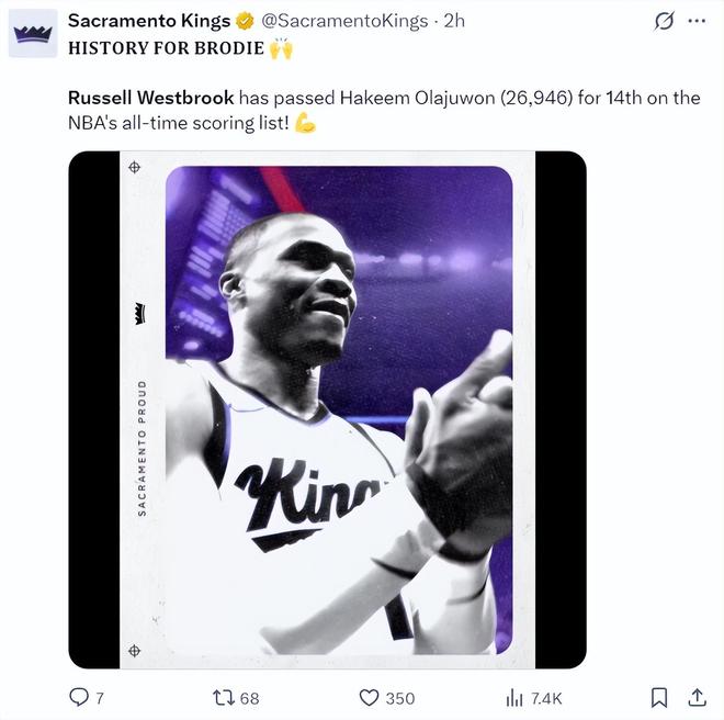 国王官方庆祝威少历史总得分榜升至第14位,超越奥拉朱旺26946分,下一个将追逐埃尔文-海耶斯的27313分。