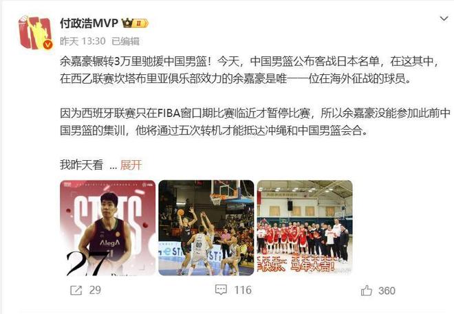 根据媒体人付政浩的消息,西班牙联赛只有在FIBA窗口期比赛临近的时候才会暂停比赛,所以留给余嘉豪的时间非常短,当地时间昨天晚上他还在打比赛,今天连续周转5次航班累计飞行超过1.4万公里才能抵达冲绳,这种精神值得所有男篮球员们学习。昨天客场的比赛是在西班牙位于非洲的飞地梅利利亚打的,比赛结束后余嘉豪先从梅利利亚飞往马加拉,然后再飞回巴塞罗那,从巴塞罗那飞往北京,再从北京飞往东京,最后一程是东京飞往冲绳。