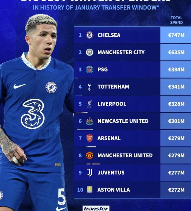 冬窗历史转会支出榜:切尔西7.47亿欧居首,前十英超占8席