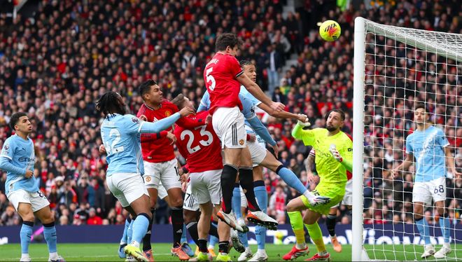 开场只有3分钟,曼联就通过定位球制造威胁,B费开出角球,马奎尔禁区内高高跃起,头球击中横梁弹了出来。