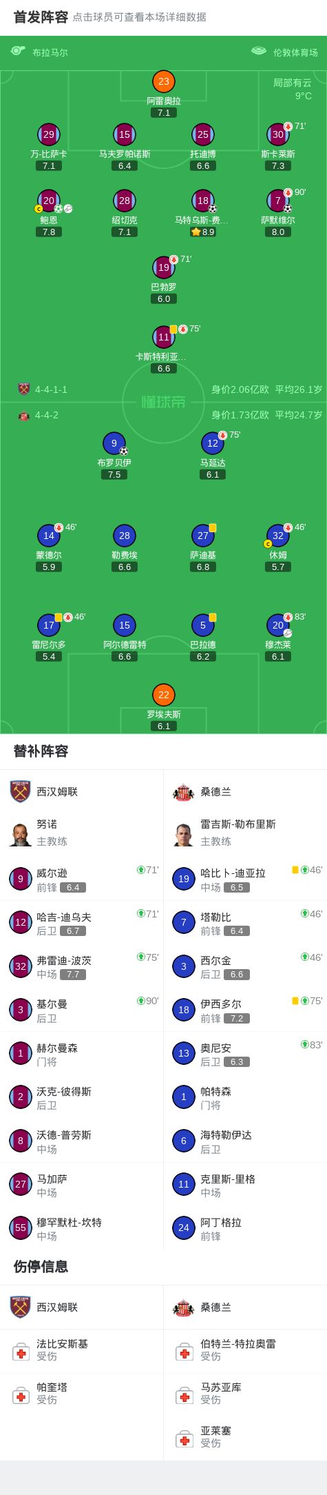 第28分钟,斯卡莱斯造点,鲍恩主罚点球命中,西汉姆联2-0桑德兰