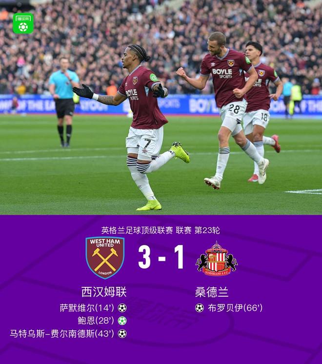 北京时间1月24日,英格兰足球超级联赛第23轮,西汉姆联主场对阵桑德兰。鲍恩送出助攻,萨默维尔破门得分;随后鲍恩主罚命中点球;上半场临近结束前,马特乌斯-费尔南德斯再入一球。下半场,穆杰莱助攻布罗贝伊为桑德兰扳回一城。最终,西汉姆联以3比1取胜。