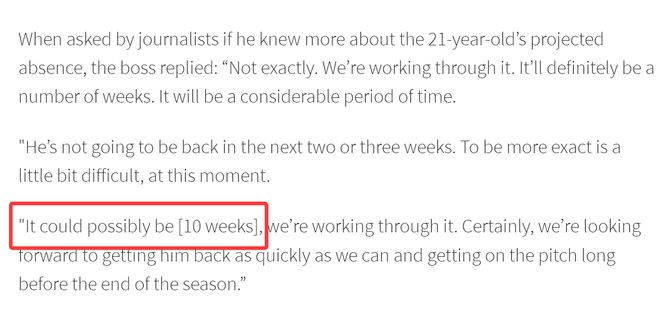 目前还没有确定的多古伤势恢复时间表,传闻其可能缺阵8个星期,而卡里克承认,伤缺时间或许会更长,达到10个星期。不过,卡里克坚信多古会比之前更强势地回归,保持自己的最佳状态。