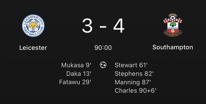 然而眼看胜局在握,莱斯特城却在下半场离谱崩盘。斯图尔特、斯蒂芬斯和曼宁在第61分钟至第87分钟这短短的26分钟内连进3球,帮助做客的南安普顿扳平比分。