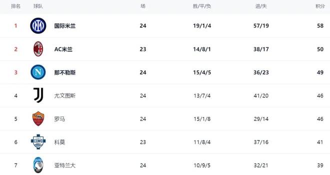 榜首位置依旧被国际米兰牢牢占据,他们目前以58分的积分领跑积分榜,战绩为19胜1平4负,优势十分明显。或许有球迷会疑惑,国际米兰输球的场次并不算少,为什么还能稳居榜首?核心原因就在于他们的平局极少,赢球的场次是目前联赛中最多的,凭借着超高的赢球效率,成功稳住了榜首位置,牢牢掌握着争冠主动权。
