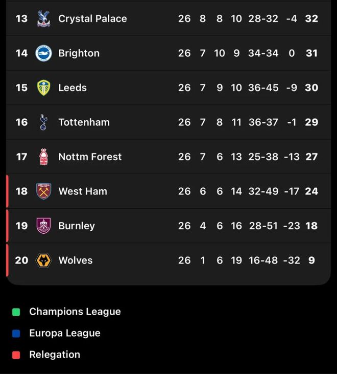 保级区球队的管理层坚信,换帅能带来立竿见影的效果。西汉姆联就是一个成功案例:努诺执教后,球队过去5轮赢下3场,积分达到24分,与安全区的分差缩小至3分。随着赛季进入最后三分之一,英超排名靠后的球队已经不敢马虎大意。在成功保级留在英超价值将超过1.7亿英镑的背景下,保级大战的残酷性不仅在于技战术比拼,更在于心理抗压能力。对于诺丁汉森林和热刺来说,赛季最后12轮将是生死考验,每一分都可能价值千金。