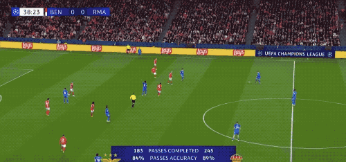 上半场的后半段,皇马开启了狂轰滥炸模式,本菲卡逐渐陷入被动,门前险象环生,切鲁宾成为场上最忙碌的球员。