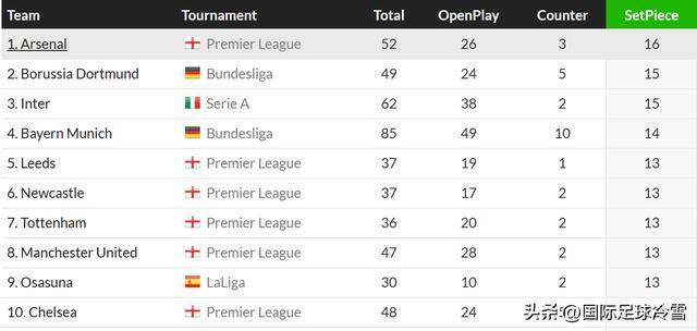 本轮赛前,国米依靠角球、任意球攻入13个联赛入球,是五大联赛所有球队中排名第四的球队,仅少于阿森纳(16)、多特蒙德(15)、拜仁(14)三队。本战依靠定位球攻入2球后,国米已是五大联赛球队里依靠定位球破门第二多的球队,也就只落后阿森纳这一支球队了